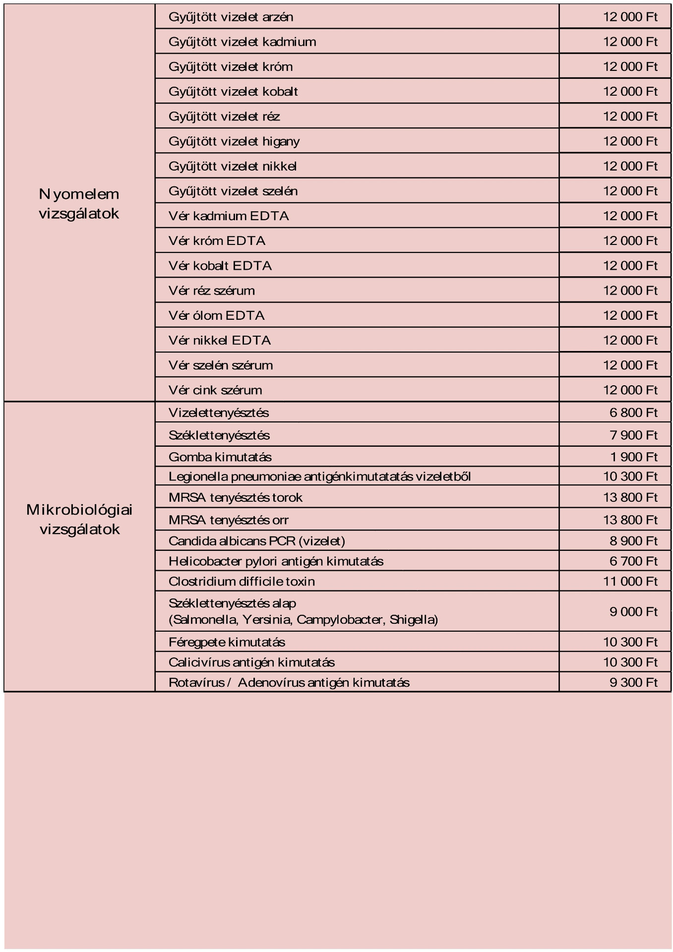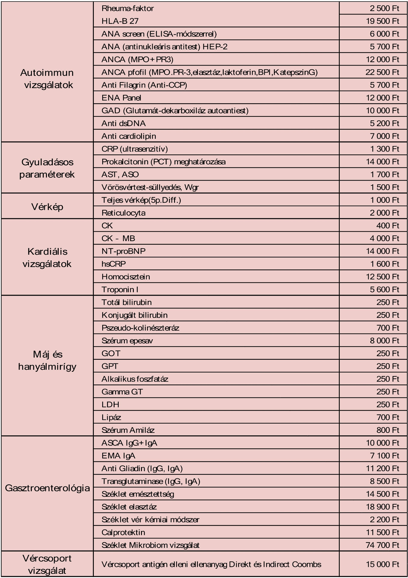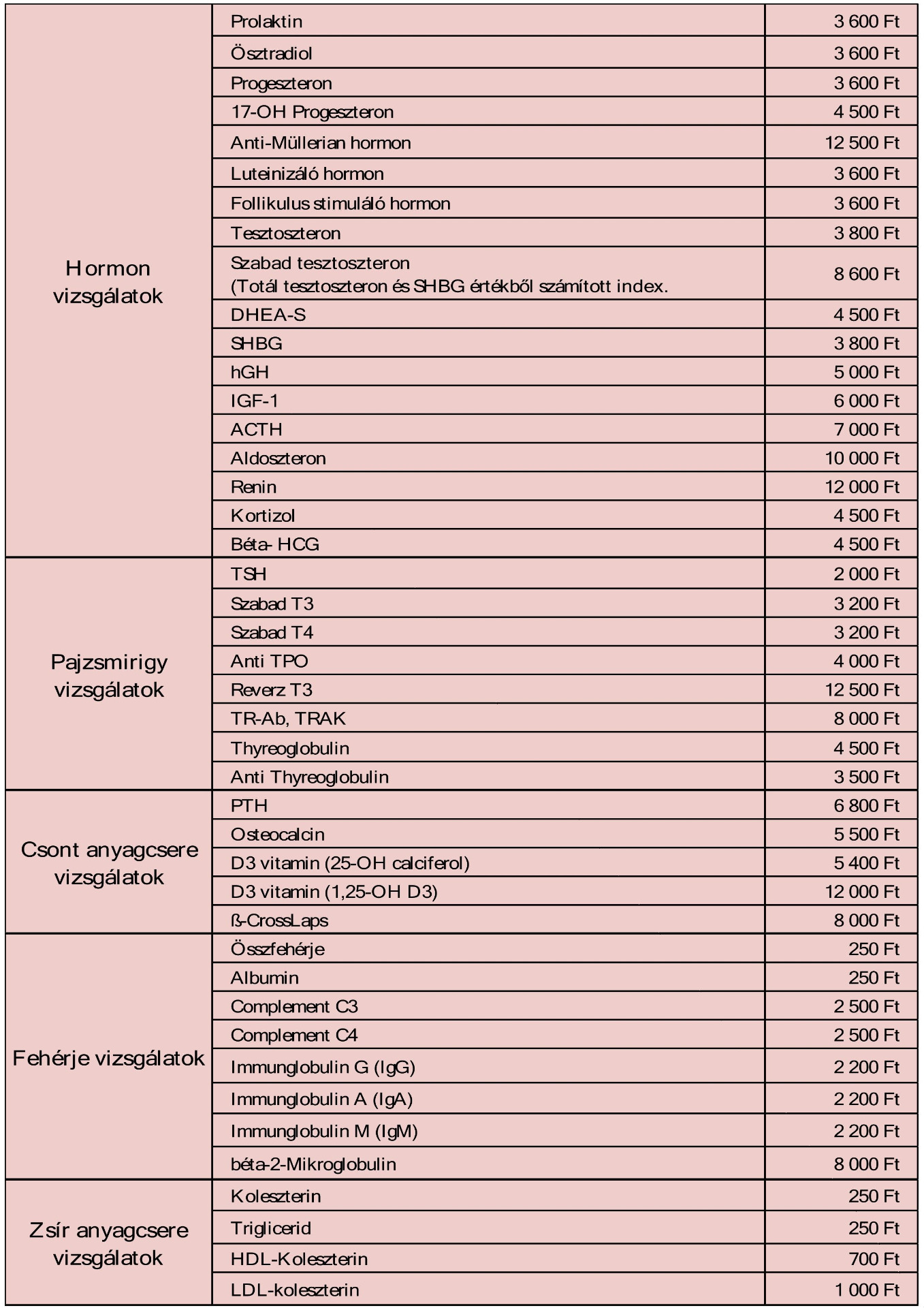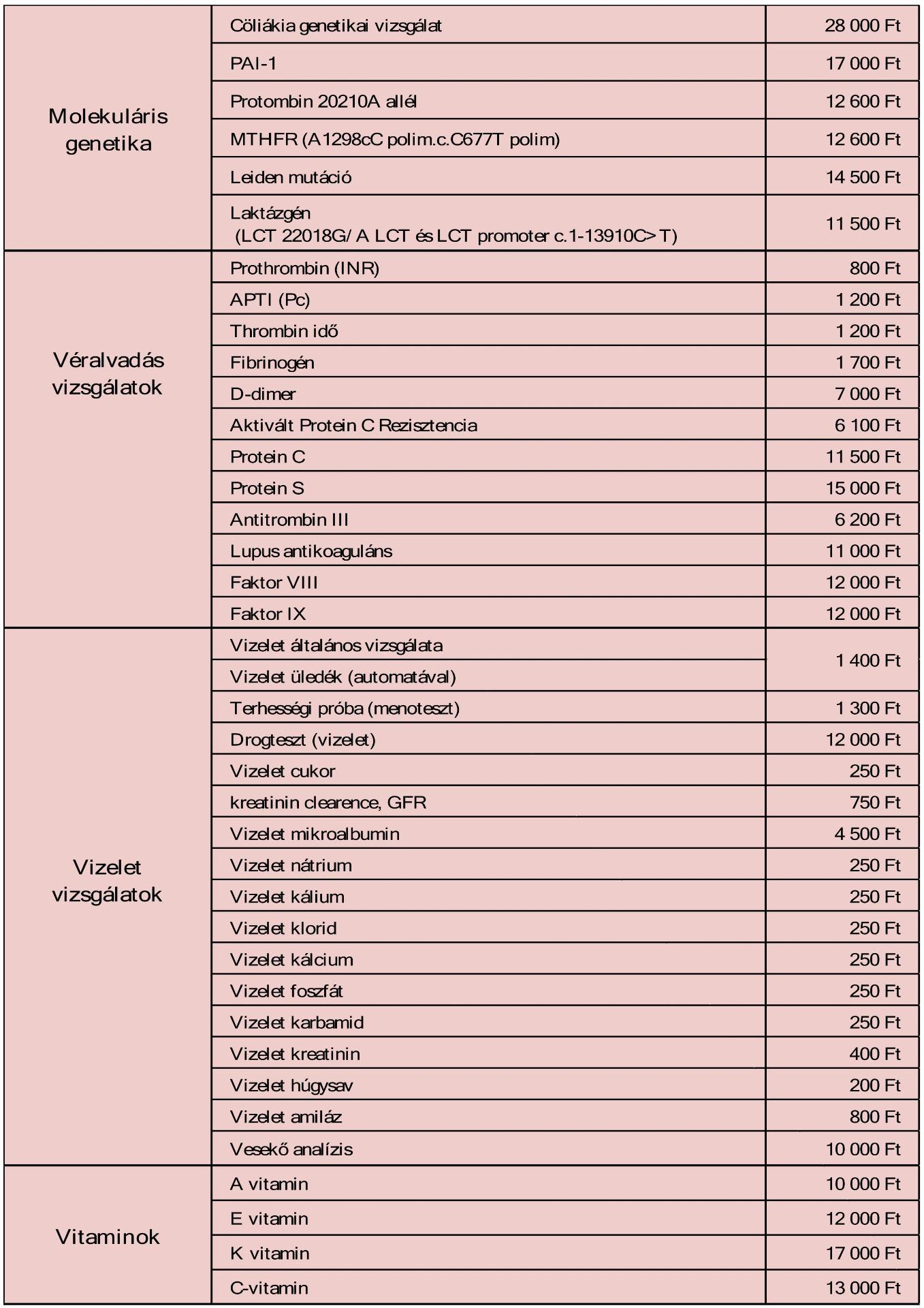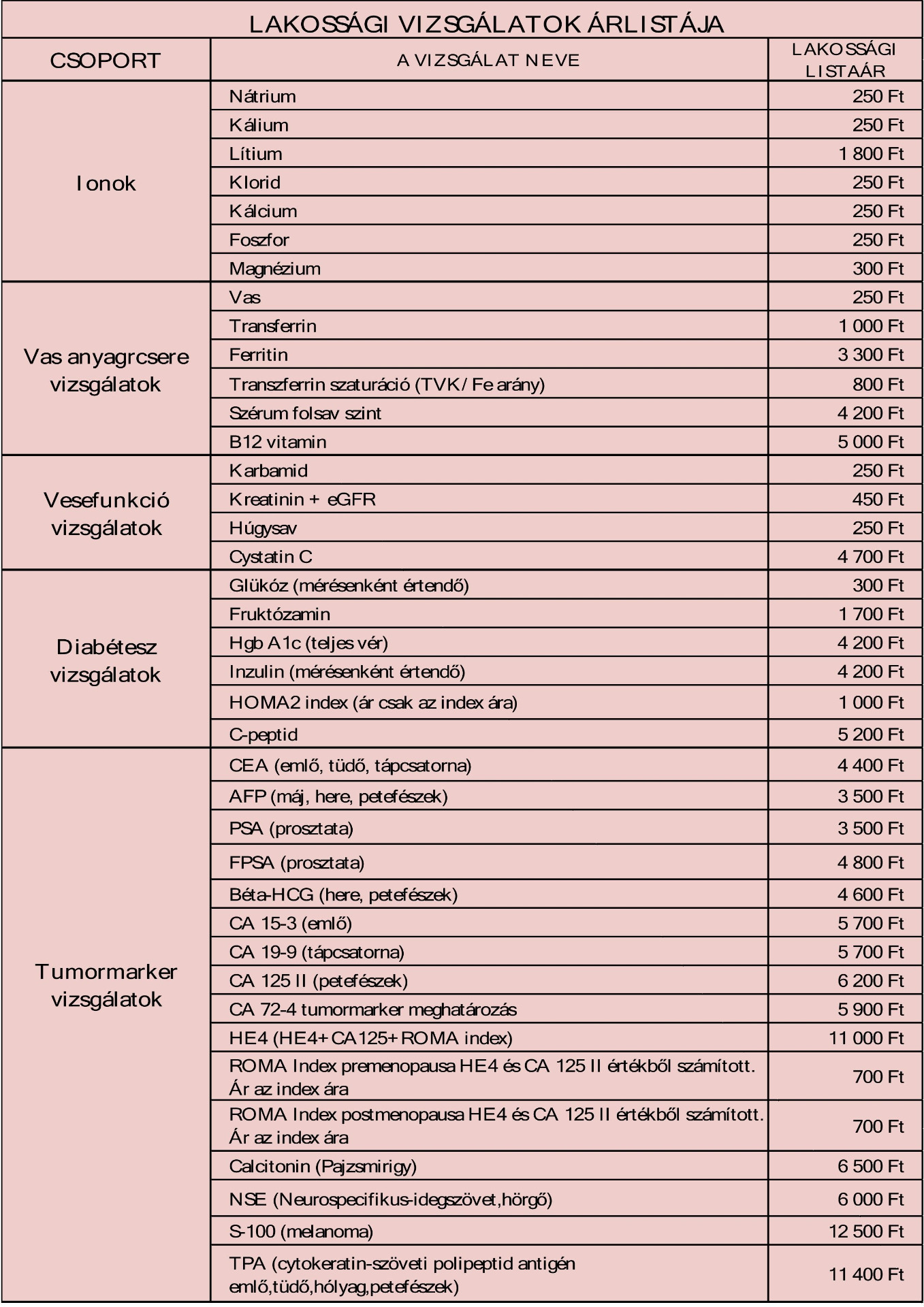 Az árak a szolgáltatás díját nem tartalmazzák,mely vérvételenként 3000 Ft